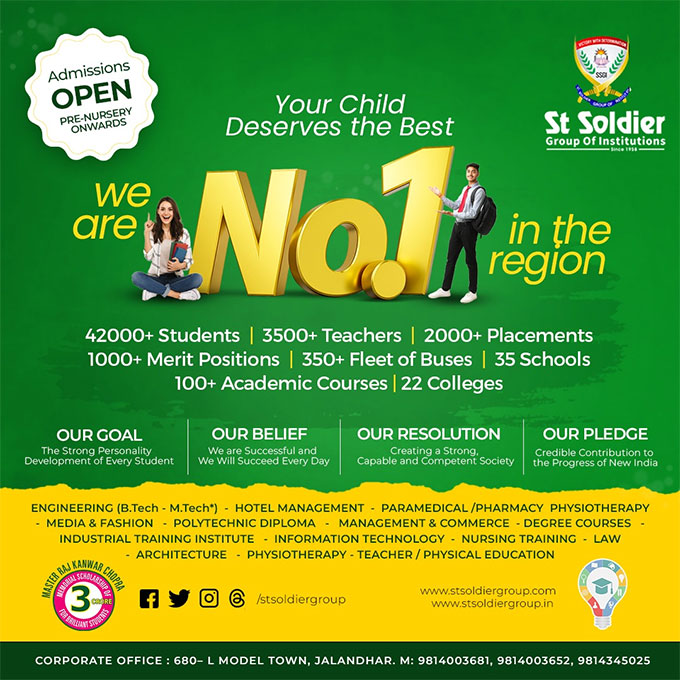 Welcome to India’s Leading Educational Group St. Soldier Group of Institutions, Jalandhar (Punjab,INDIA). We have been known for our Young, Vibrant and Responsible culture.